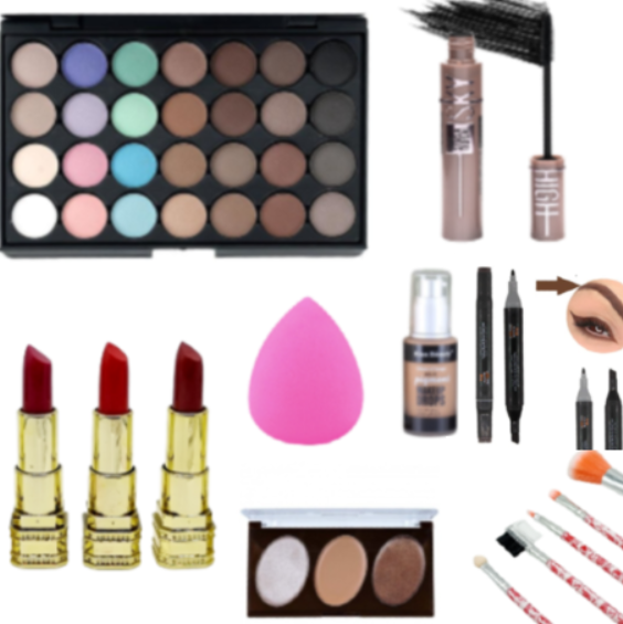 Setul contine: 1 x trusa farduri 28 culori, 3 x ruj hidratant Verri, 1 x puf tip lacrima, 1 x trusa corector, iluminator si contur Meis, 1 x fond de ten Kiss Beauty nuanta natural, 1 x set 5 pensule machiaj, 1 x contur ochi si sprincene tip carioca, 1 x mascara Miss Betty.